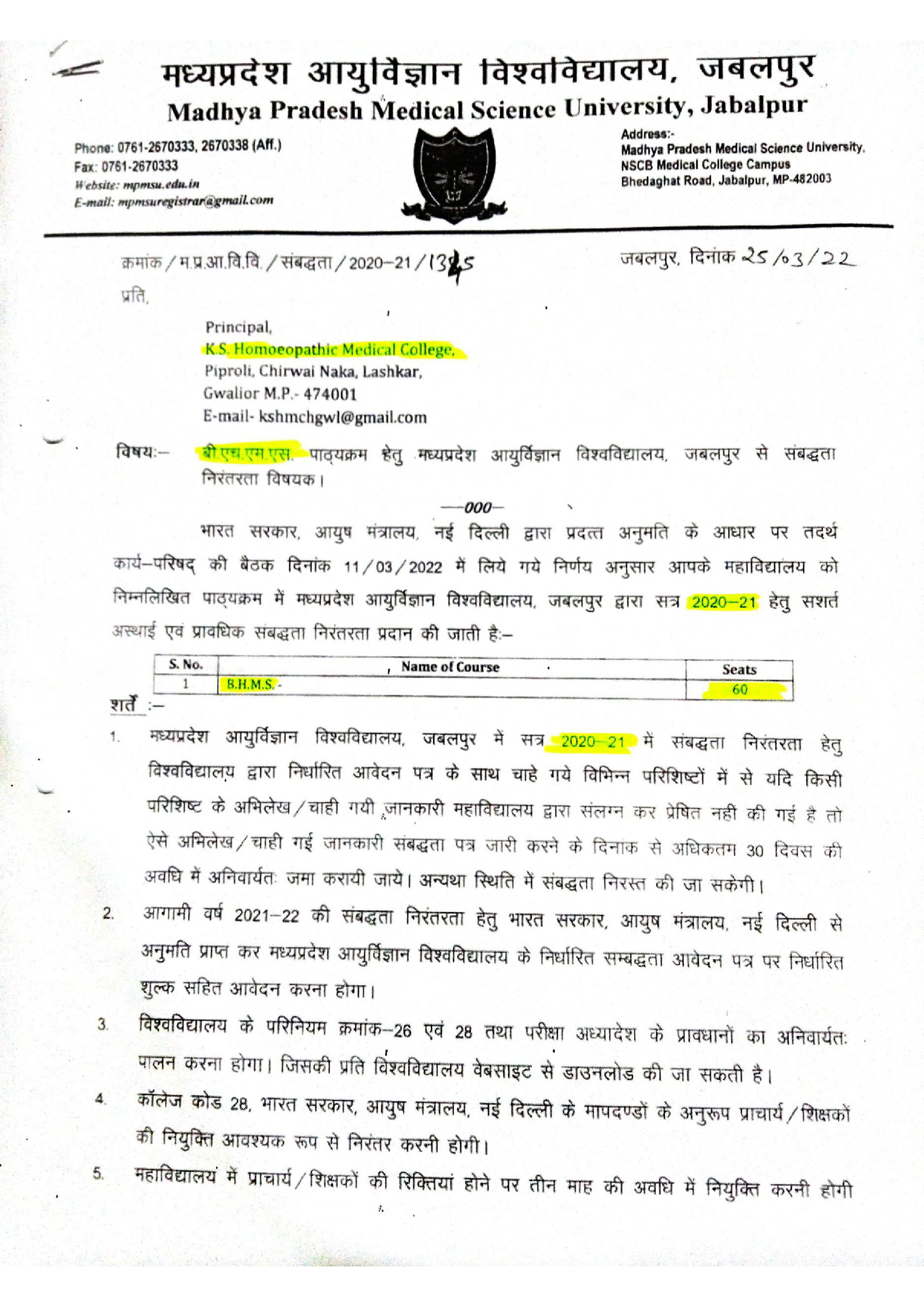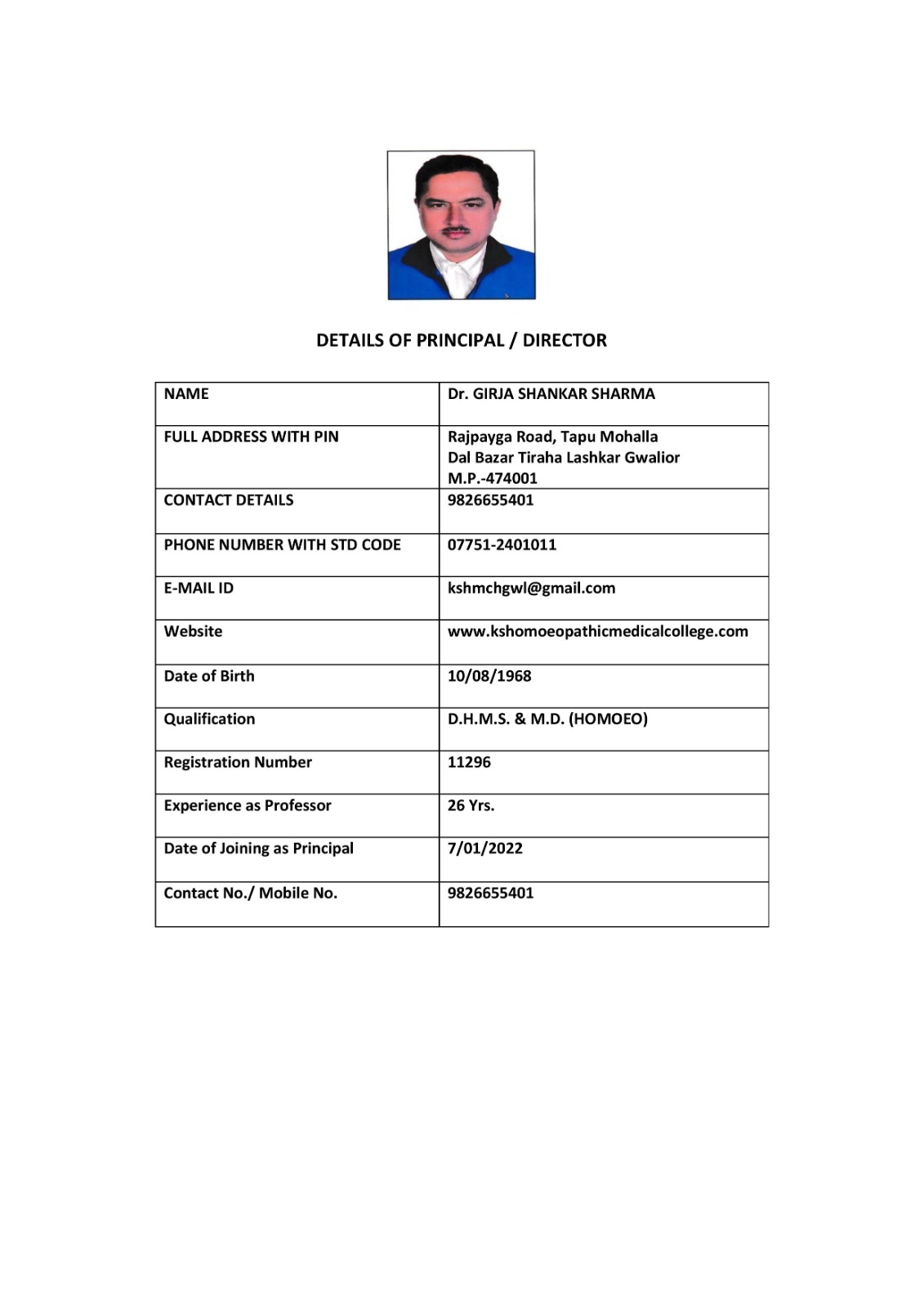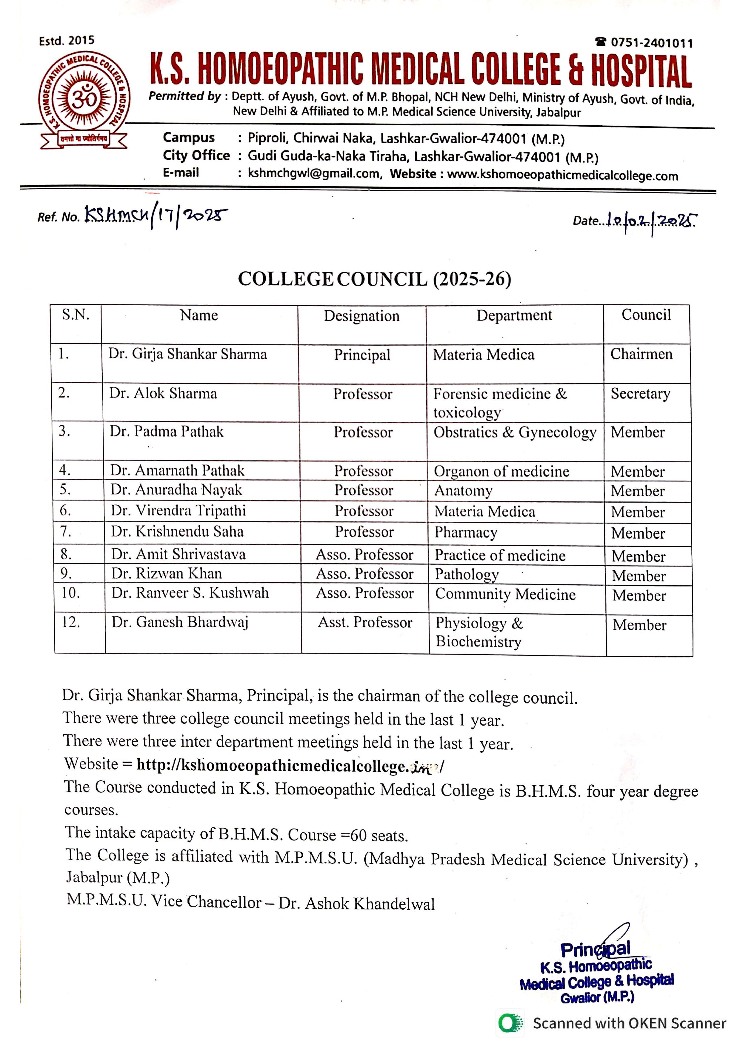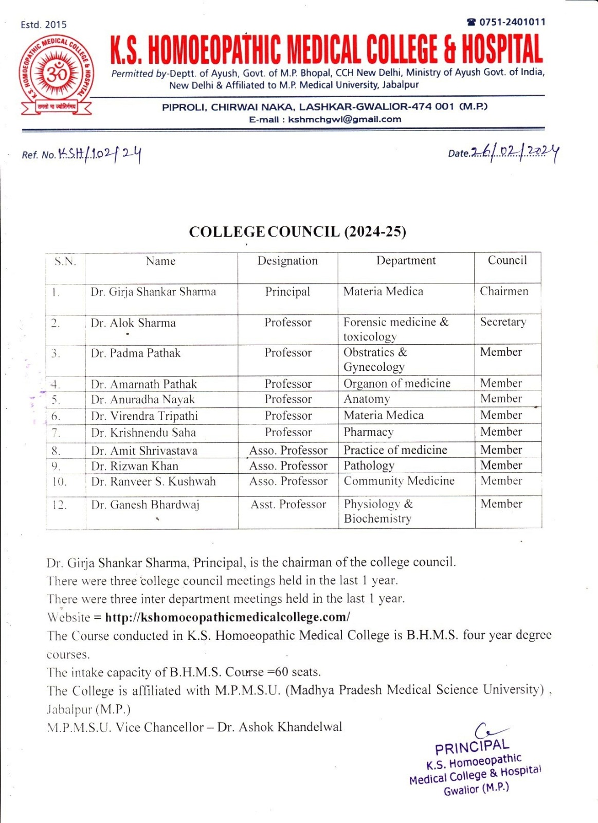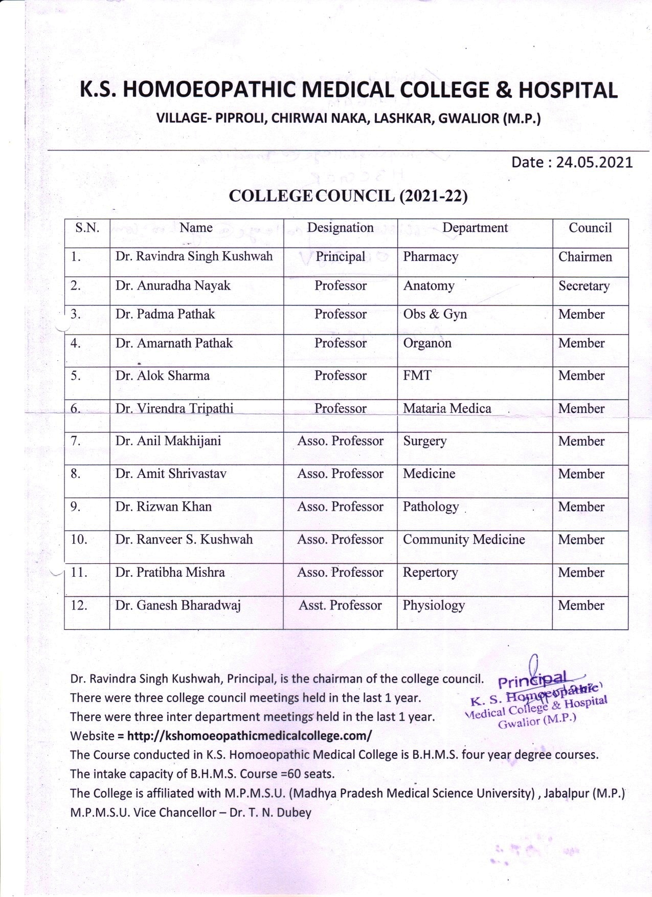 Dr. Ravindra Singh Kushwah is the Principal and chairman of the college council. There were four college council meetings held in the last 1 year. There were four inter departmental meetings held in the last 1 year. website = http://kshomoeopathicmedicalcollege.com/ The Course Conducted in KS Homoeopathic Medical College is B.H.M.S. four year degree course. The Intake capacity of B.H.M.S. Course = 60 sheats. The College is affiliated with M.P.M.S.U (Madhya Pradesh Medical Science University), Jabalpur (M.P.) M.P.M.S.U. Vice Chancellar - Dr. T.N. Dubey