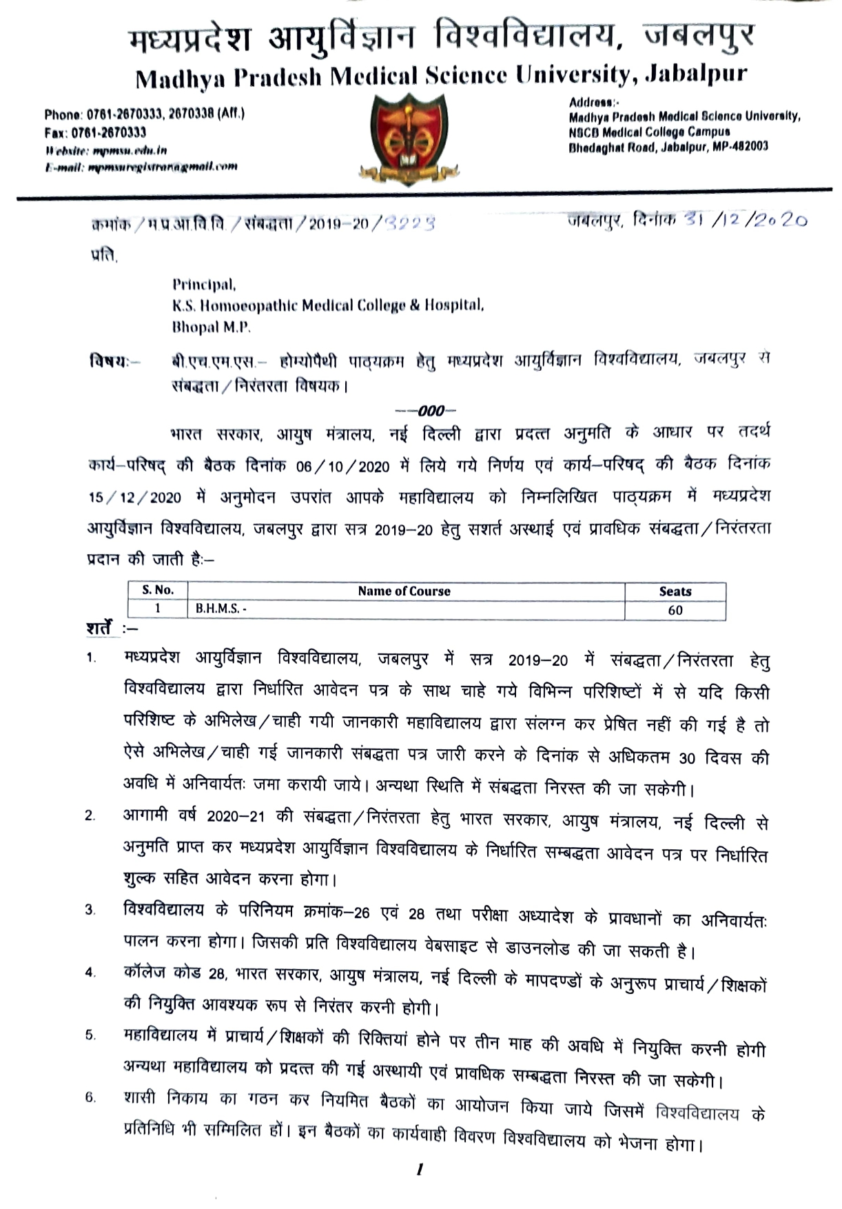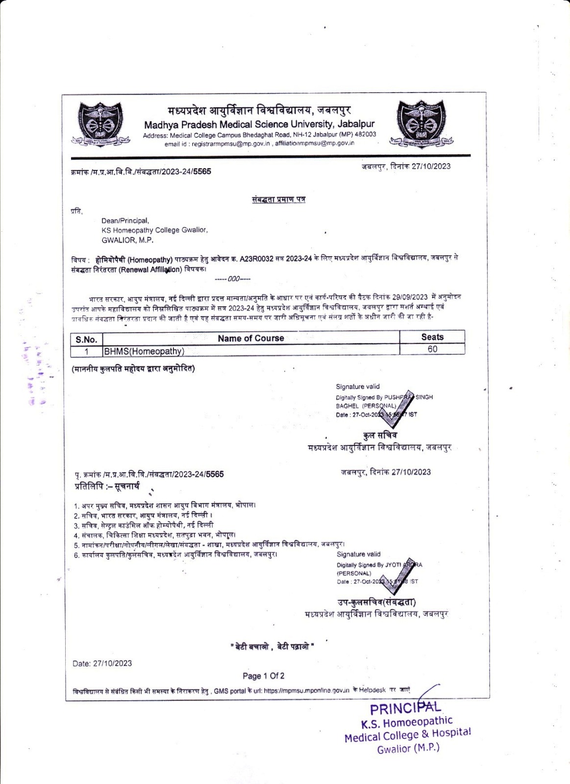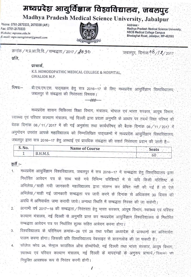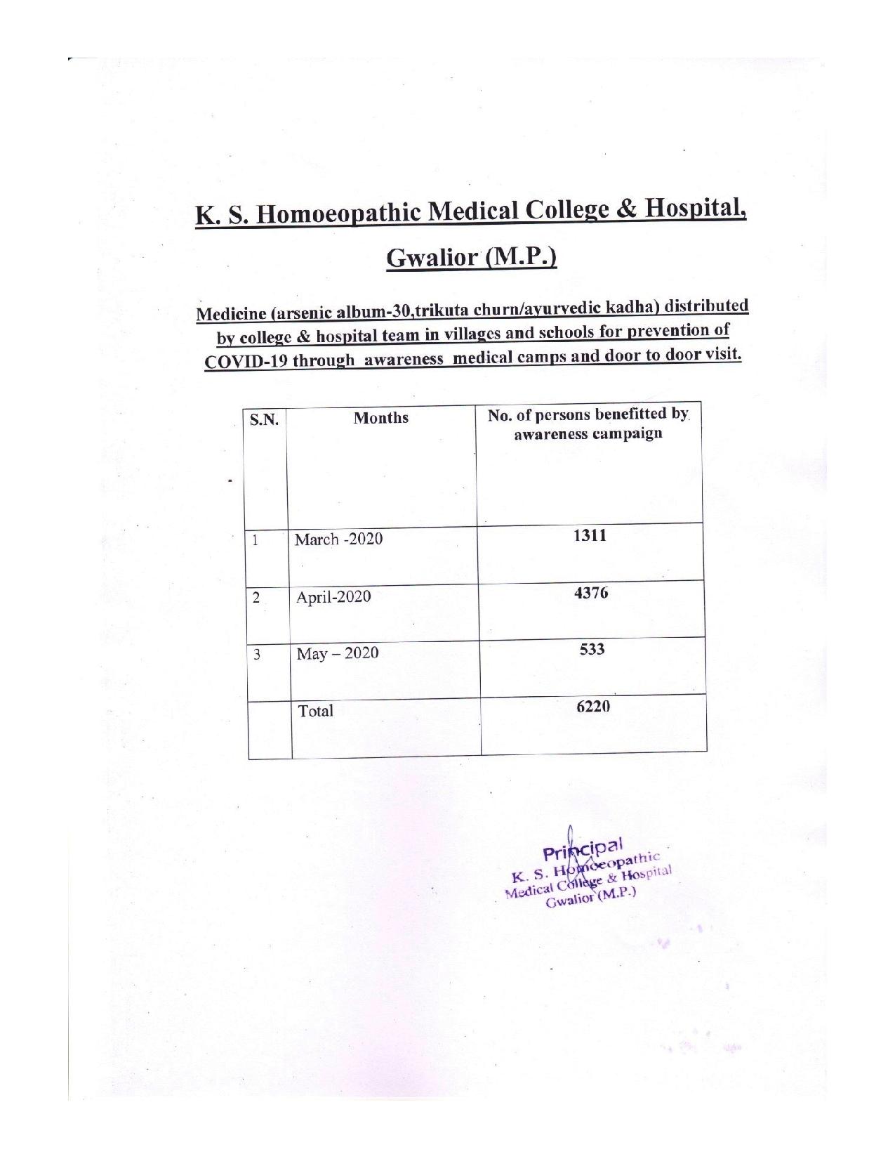 Dr. Ravindra Singh Kushwah is the Principal and chairman of the college council. There were four college council meetings held in the last 1 year. There were four inter departmental meetings held in the last 1 year. website = http://kshomoeopathicmedicalcollege.com/ The Course Conducted in KS Homoeopathic Medical College is B.H.M.S. four year degree course. The Intake capacity of B.H.M.S. Course = 60 sheats. The College is affiliated with M.P.M.S.U (Madhya Pradesh Medical Science University), Jabalpur (M.P.) M.P.M.S.U. Vice Chancellar - Dr. T.N. Dubey