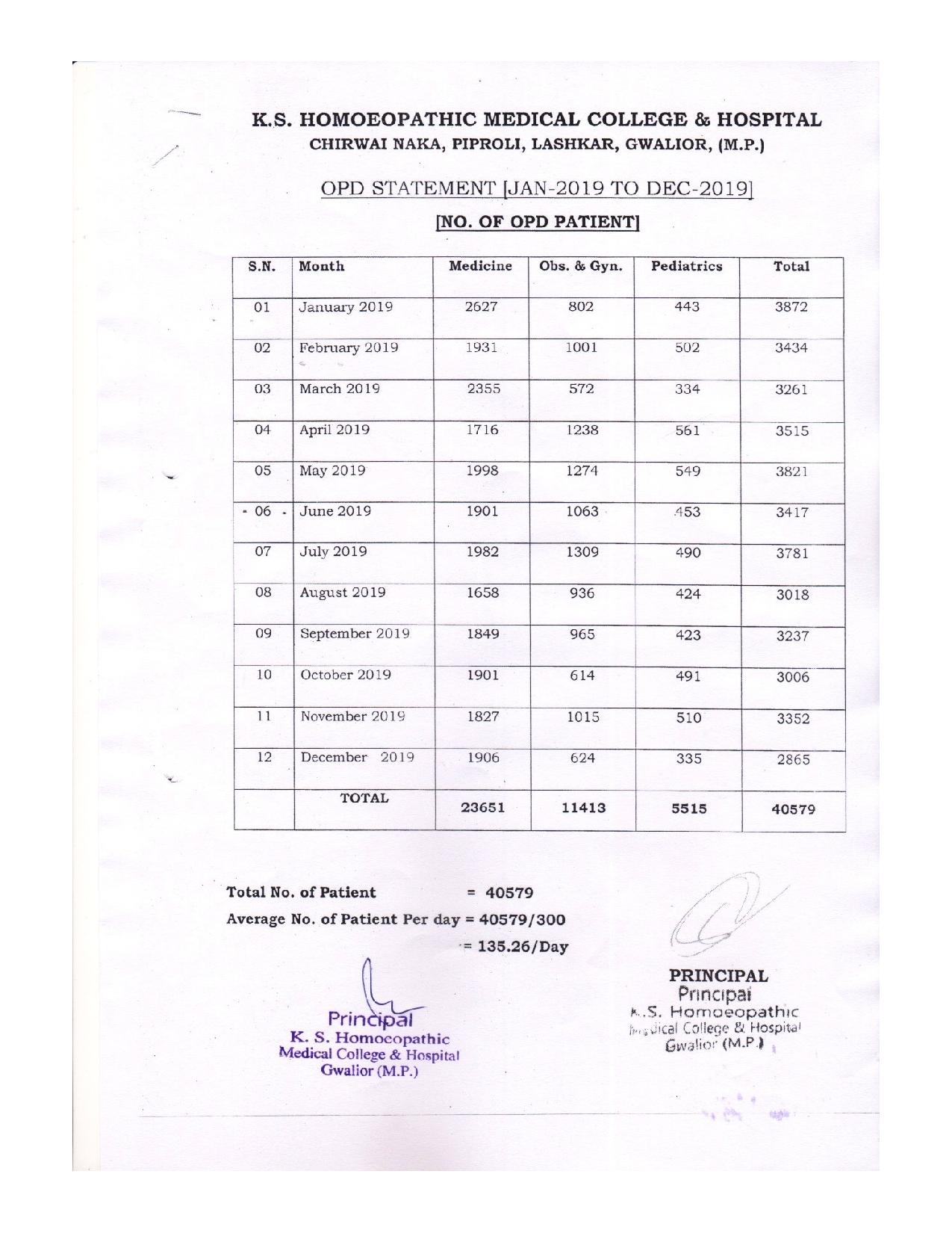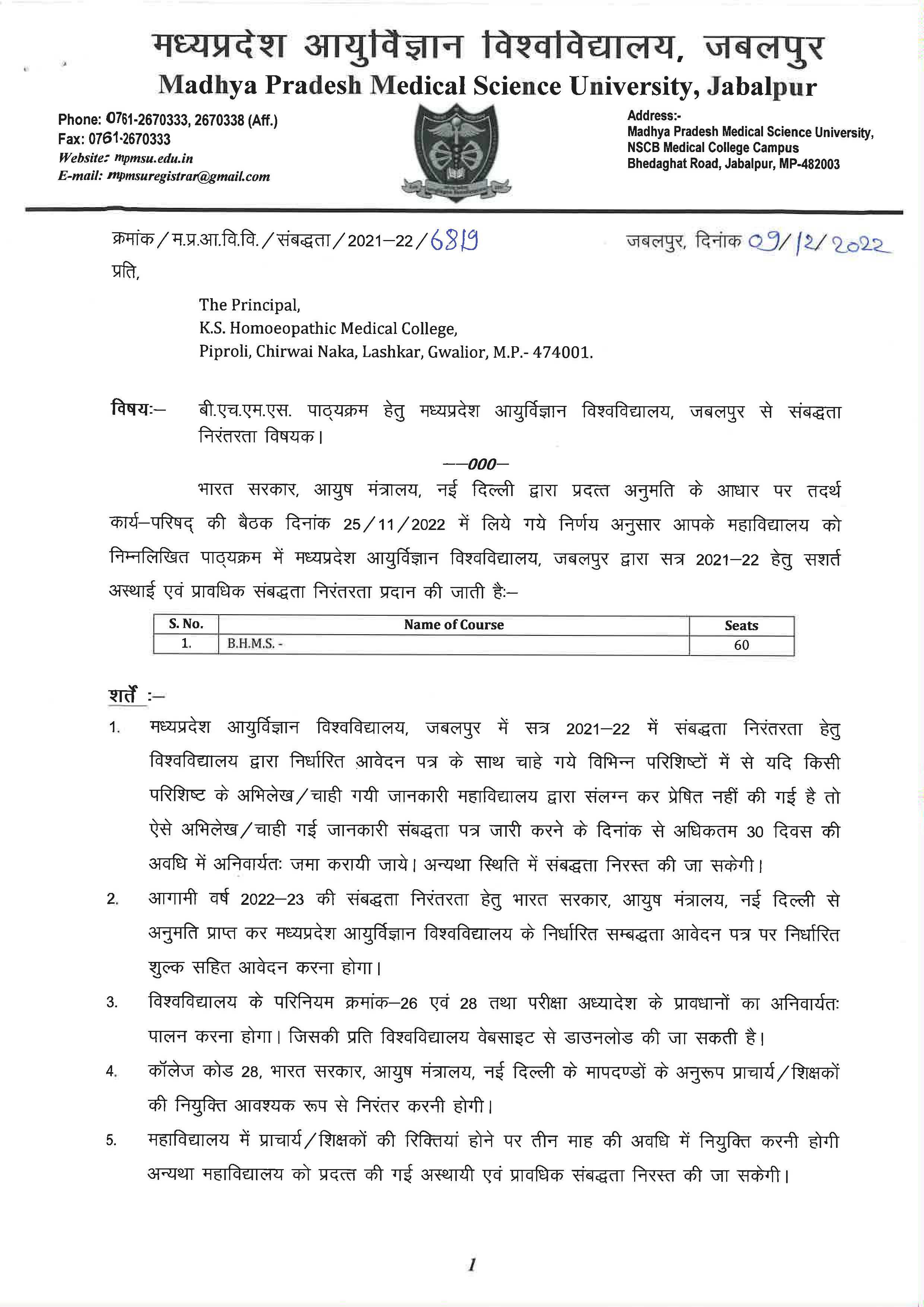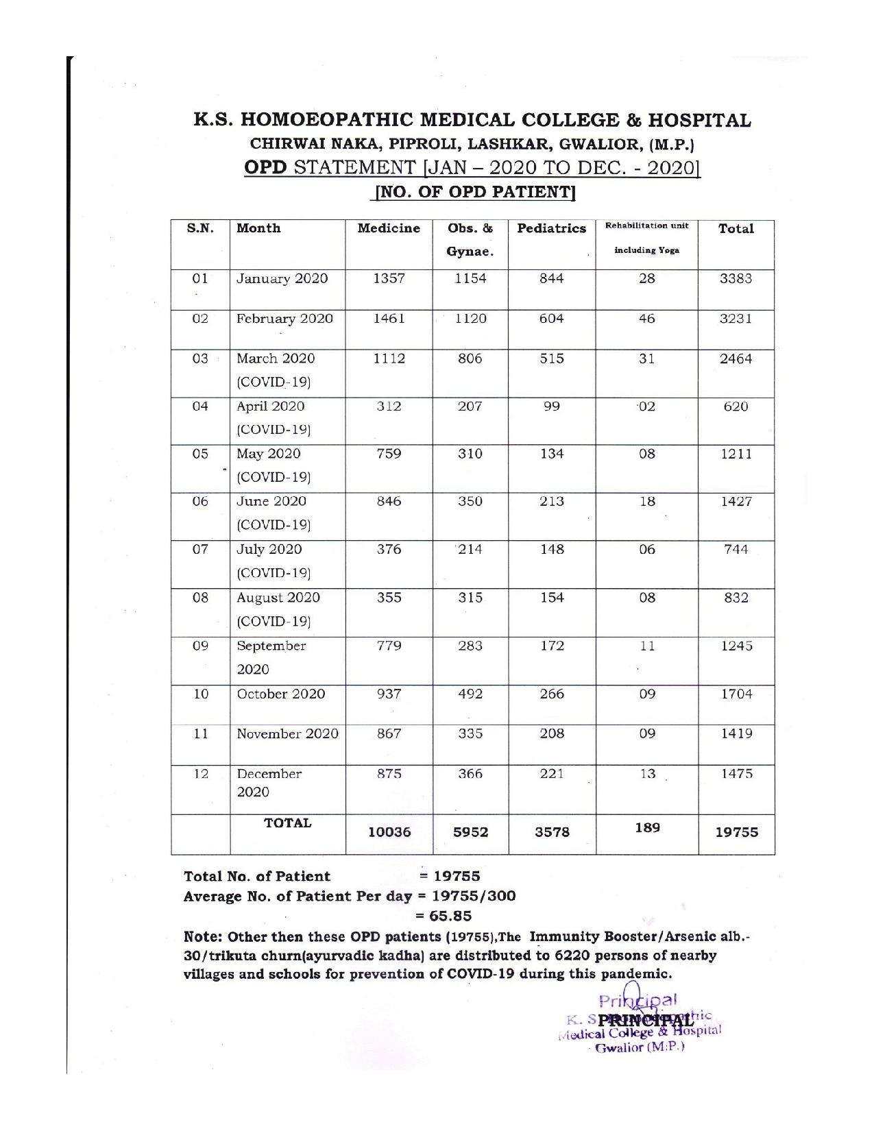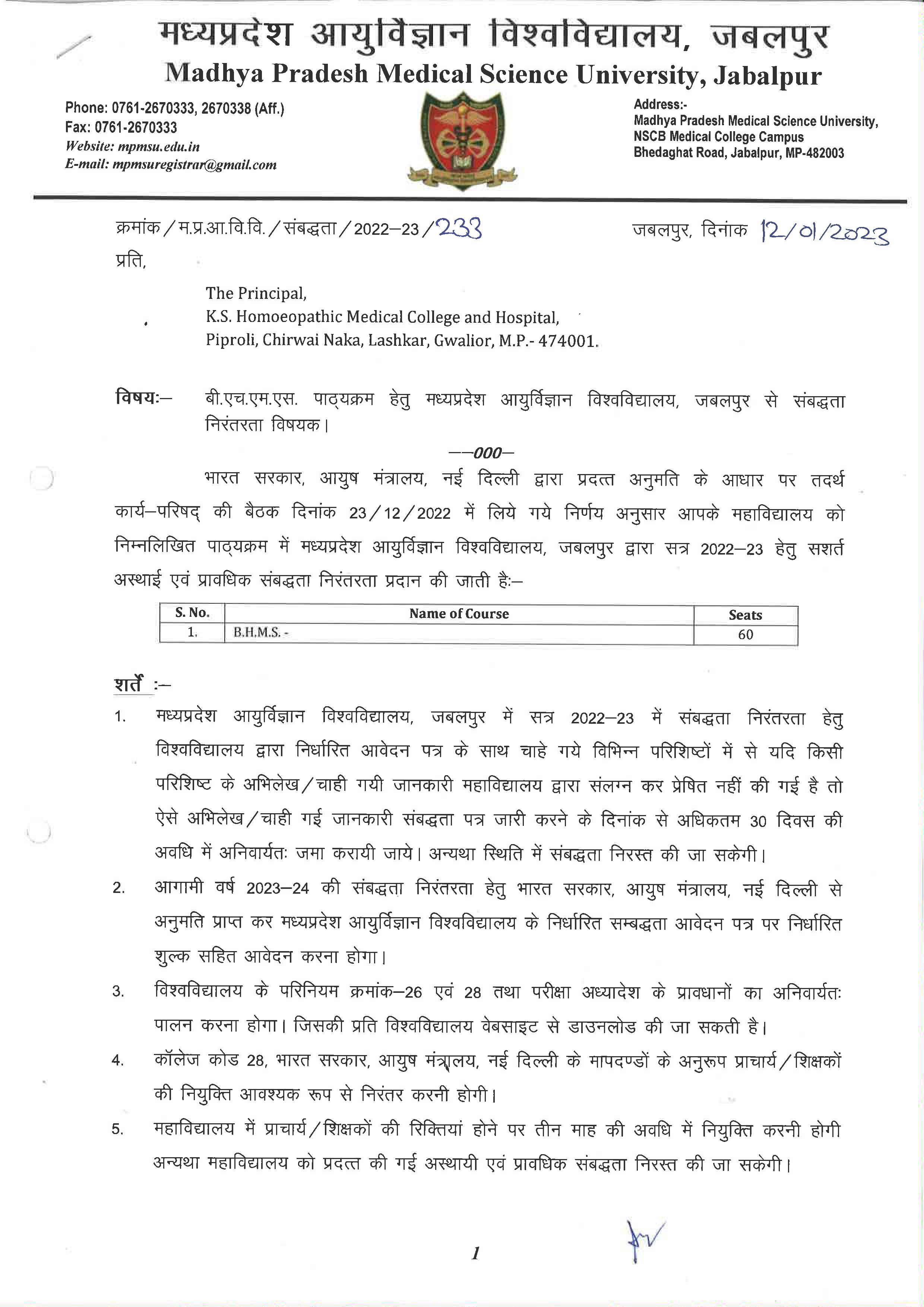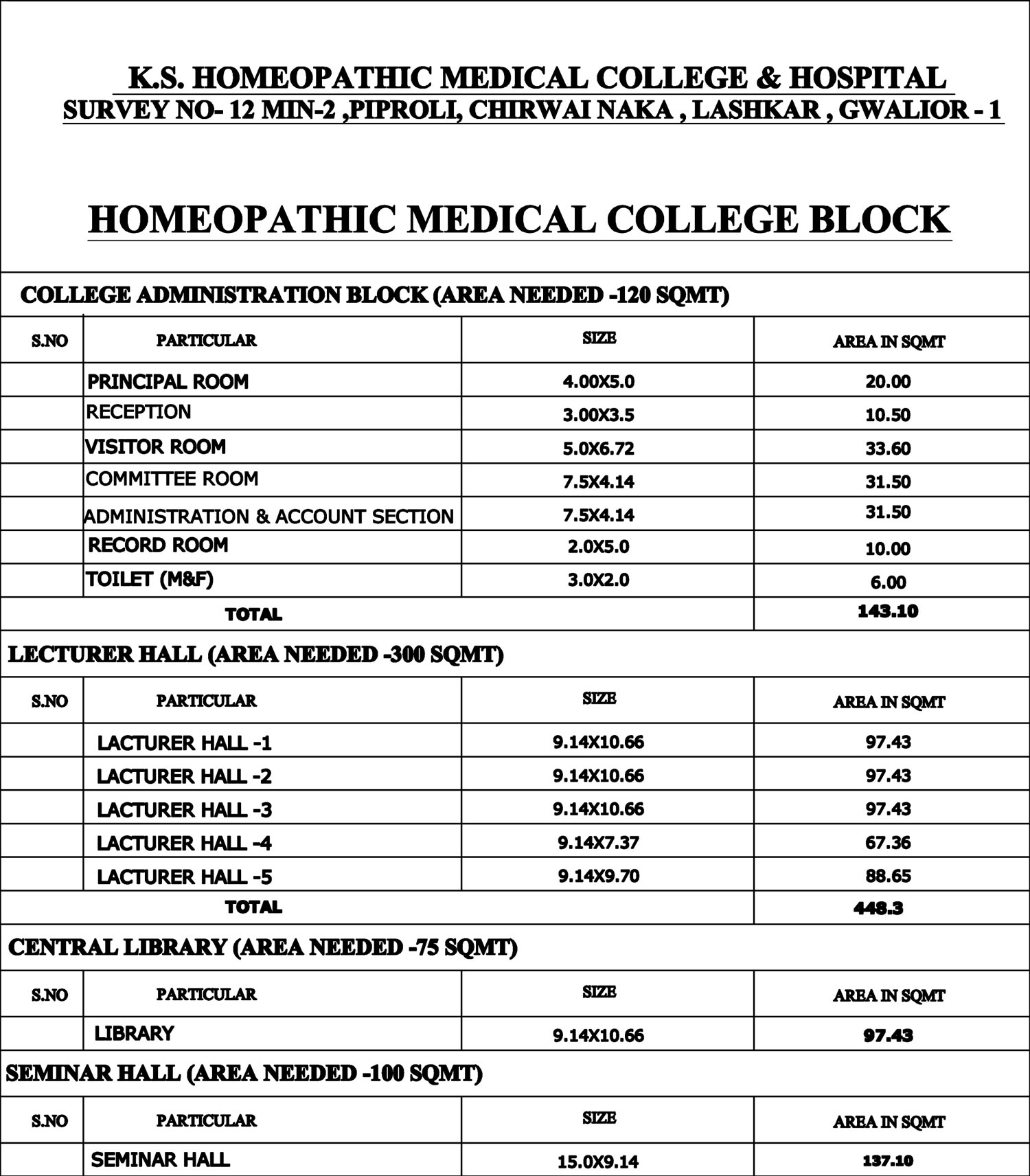 Dr. Ravindra Singh Kushwah is the Principal and chairman of the college council. There were four college council meetings held in the last 1 year. There were four inter departmental meetings held in the last 1 year. website = http://kshomoeopathicmedicalcollege.com/ The Course Conducted in KS Homoeopathic Medical College is B.H.M.S. four year degree course. The Intake capacity of B.H.M.S. Course = 60 sheats. The College is affiliated with M.P.M.S.U (Madhya Pradesh Medical Science University), Jabalpur (M.P.) M.P.M.S.U. Vice Chancellar - Dr. T.N. Dubey