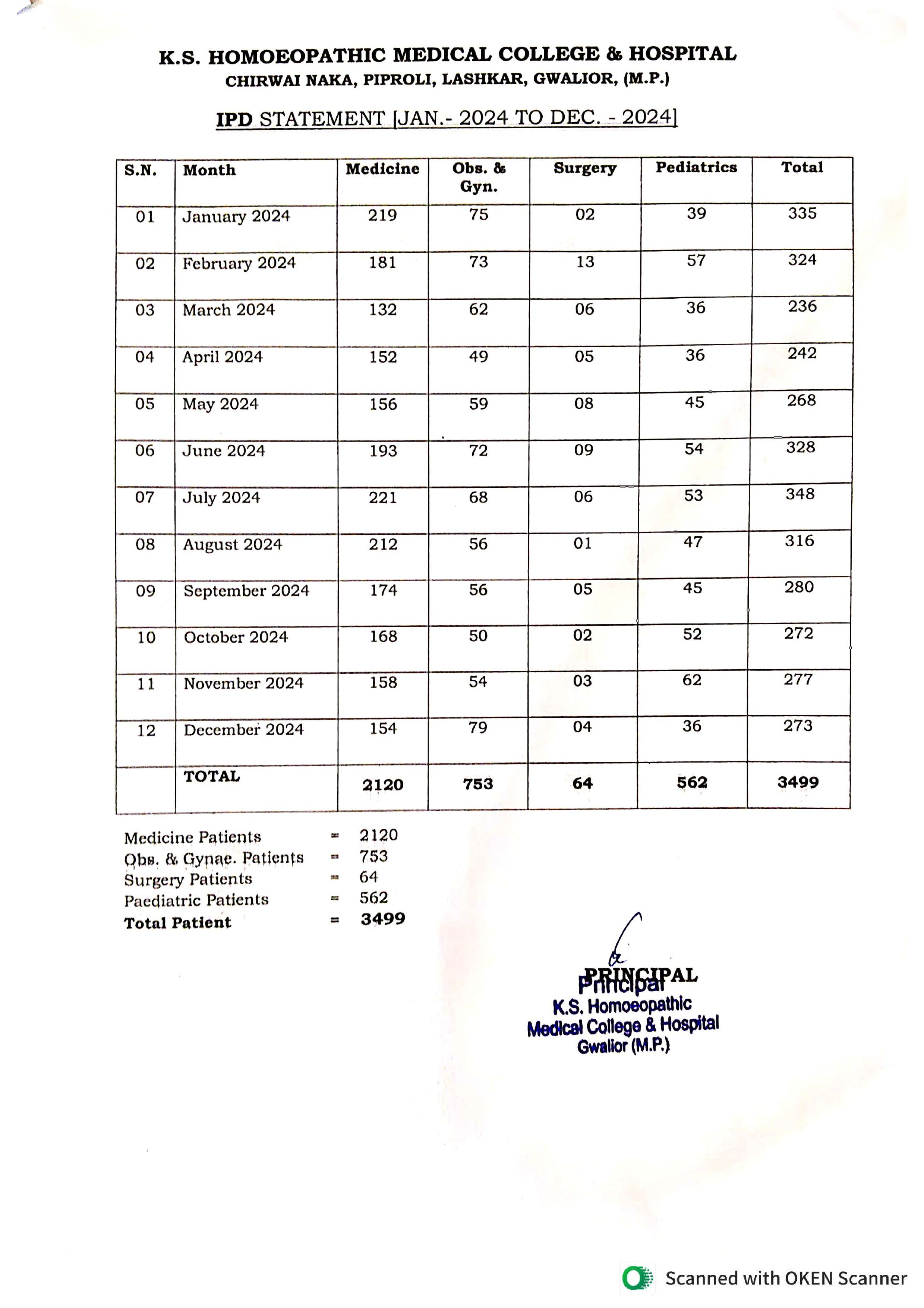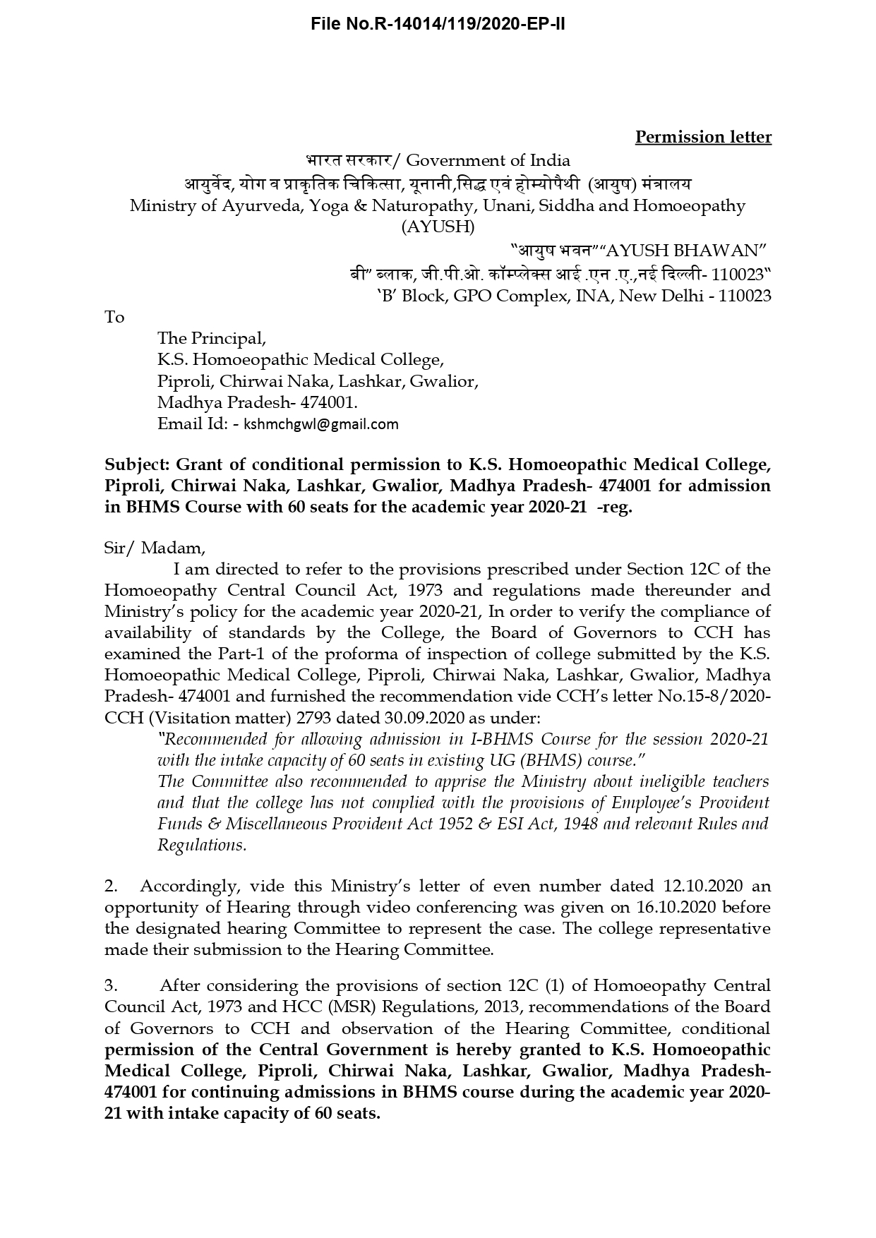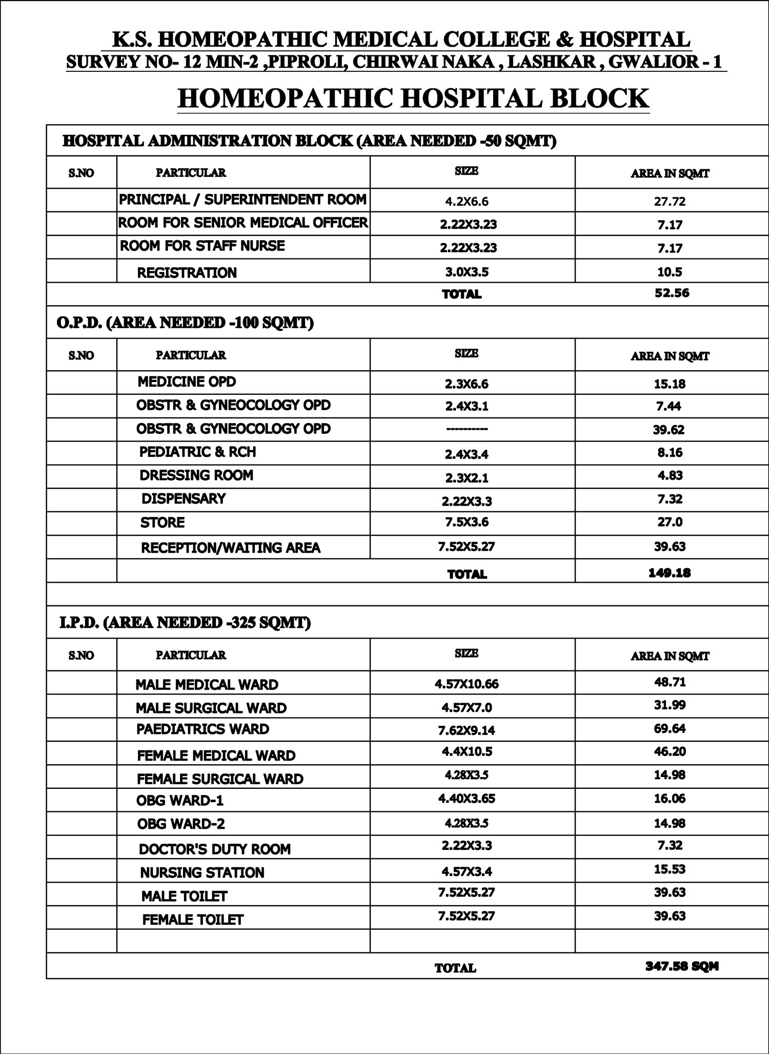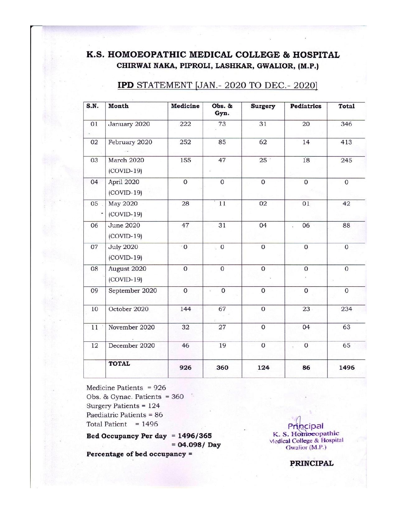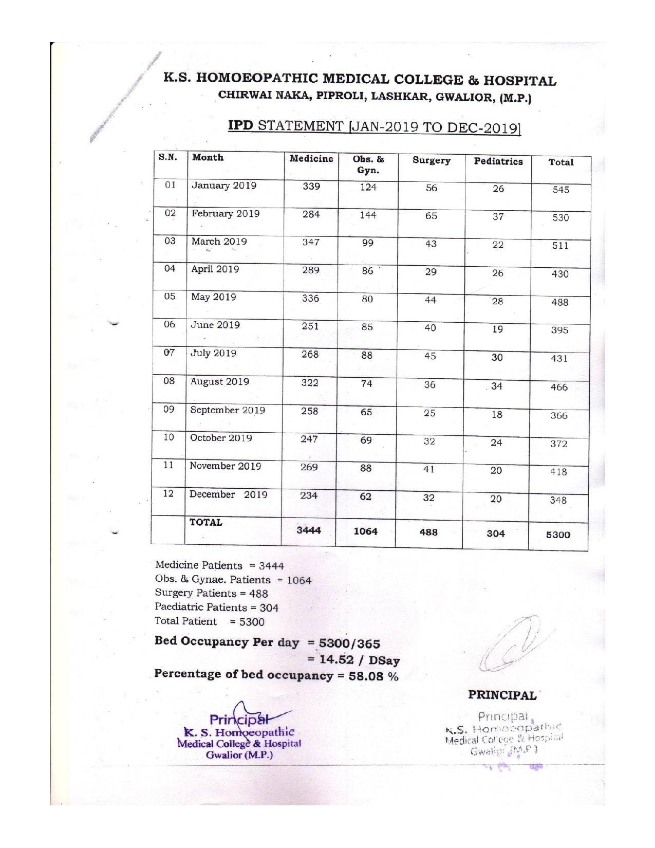 Dr. Ravindra Singh Kushwah is the Principal and chairman of the college council. There were four college council meetings held in the last 1 year. There were four inter departmental meetings held in the last 1 year. website = http://kshomoeopathicmedicalcollege.com/ The Course Conducted in KS Homoeopathic Medical College is B.H.M.S. four year degree course. The Intake capacity of B.H.M.S. Course = 60 sheats. The College is affiliated with M.P.M.S.U (Madhya Pradesh Medical Science University), Jabalpur (M.P.) M.P.M.S.U. Vice Chancellar - Dr. T.N. Dubey