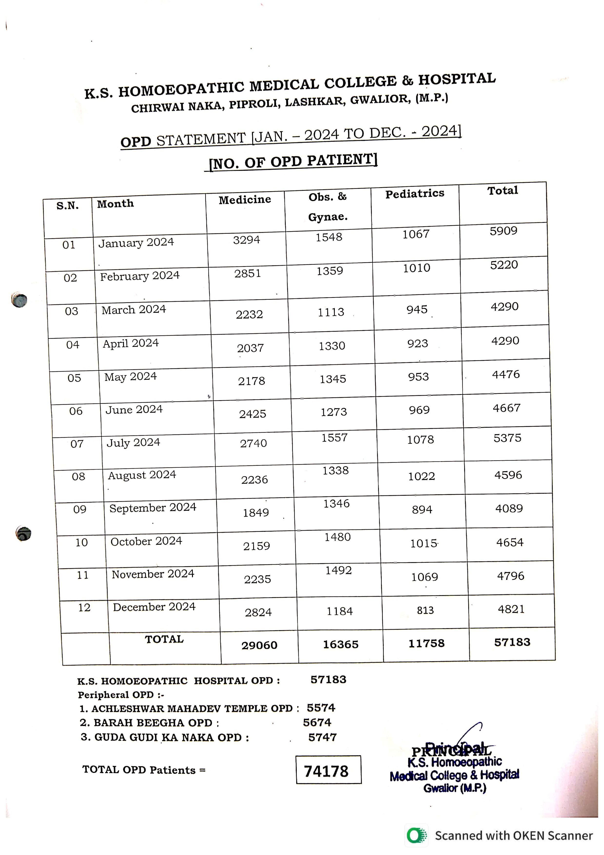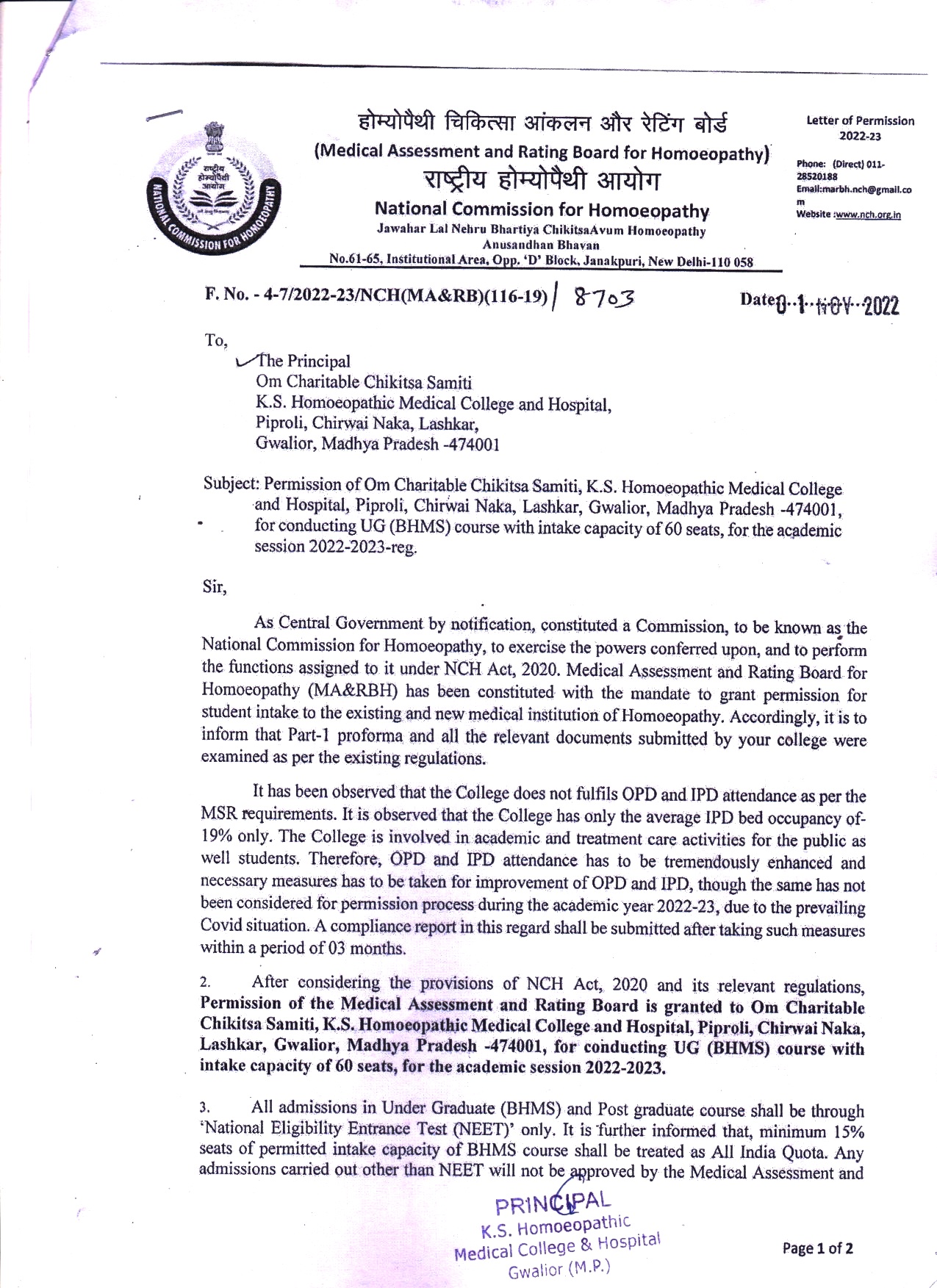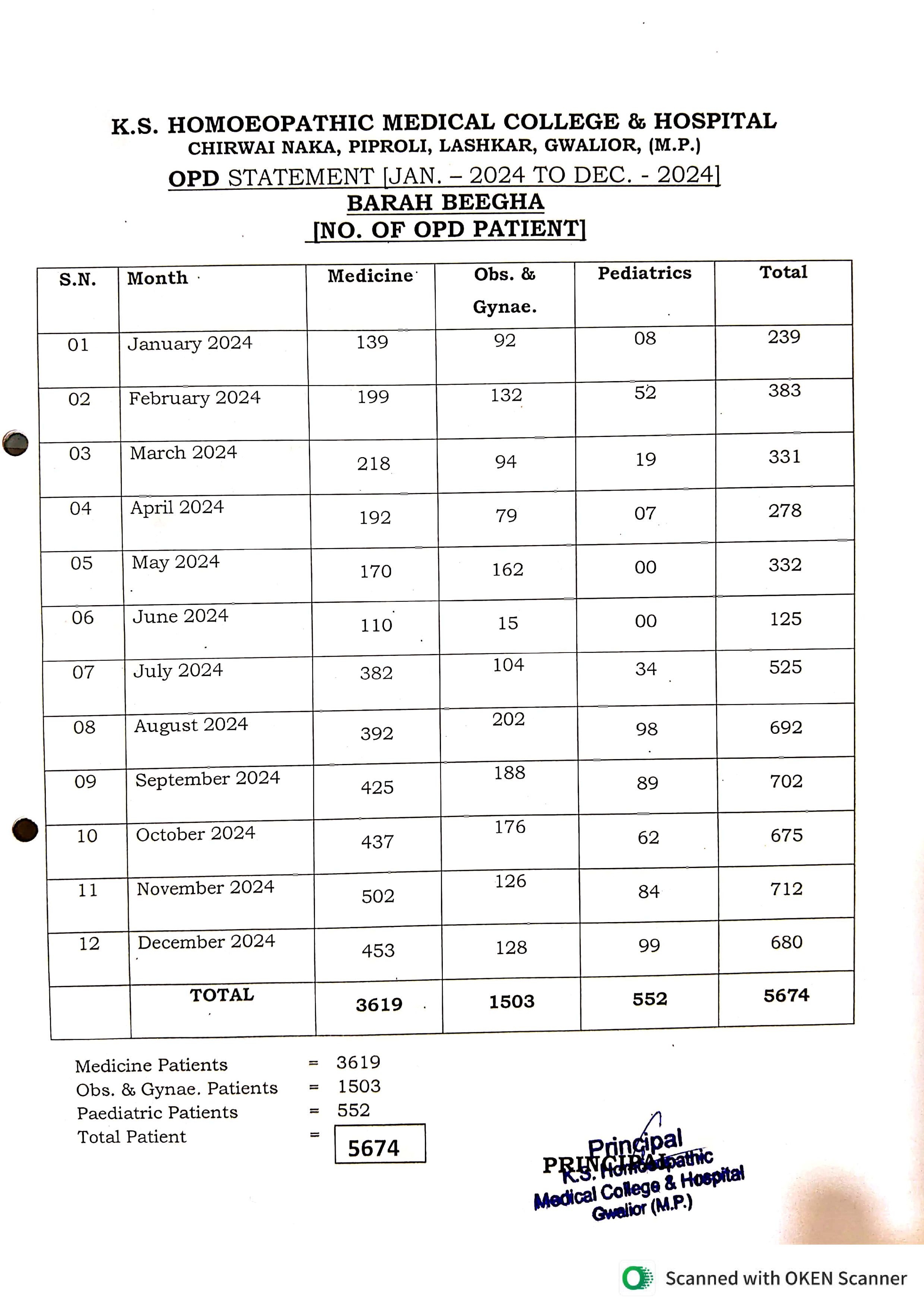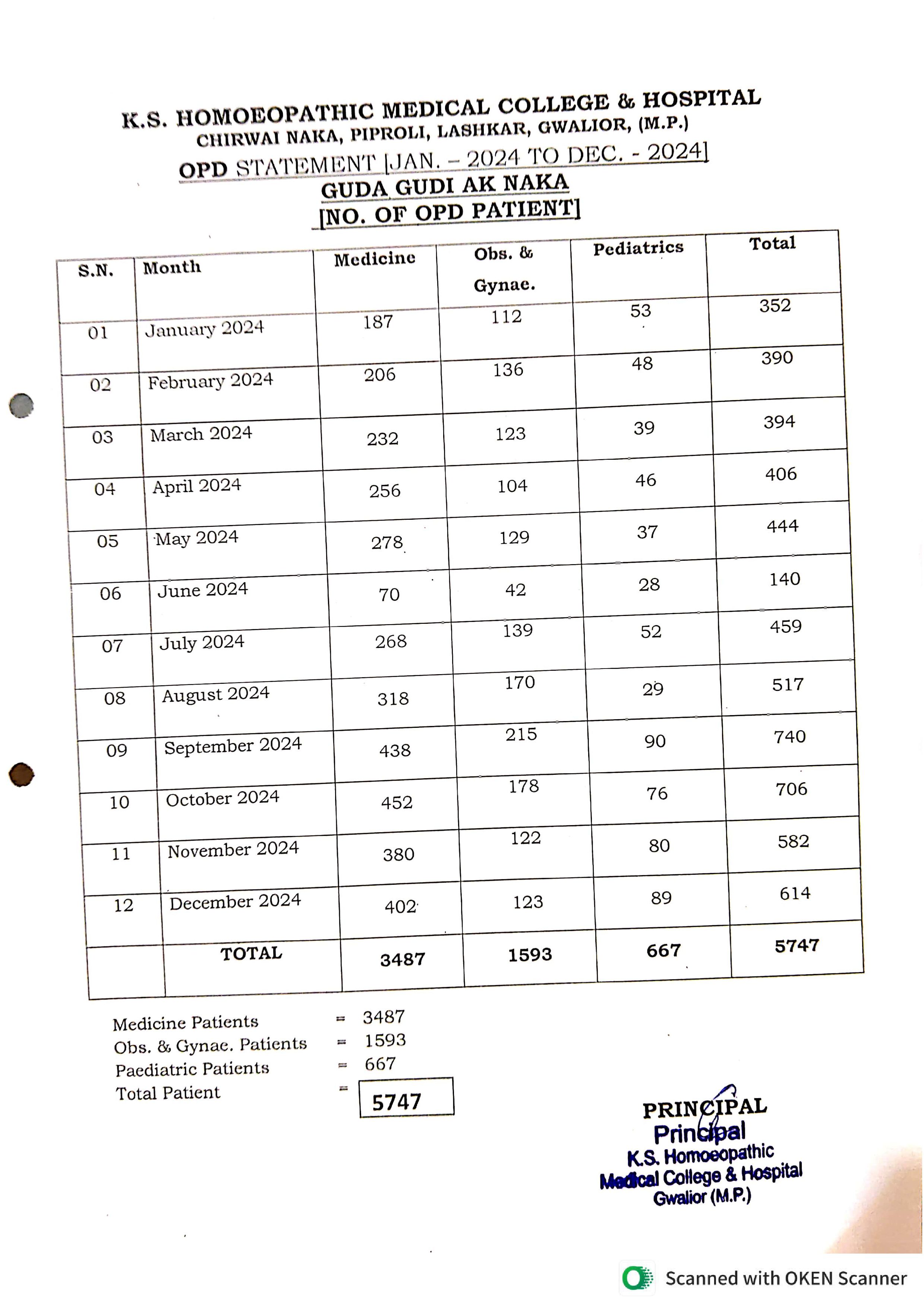 Dr. Ravindra Singh Kushwah is the Principal and chairman of the college council. There were four college council meetings held in the last 1 year. There were four inter departmental meetings held in the last 1 year. website = http://kshomoeopathicmedicalcollege.com/ The Course Conducted in KS Homoeopathic Medical College is B.H.M.S. four year degree course. The Intake capacity of B.H.M.S. Course = 60 sheats. The College is affiliated with M.P.M.S.U (Madhya Pradesh Medical Science University), Jabalpur (M.P.) M.P.M.S.U. Vice Chancellar - Dr. T.N. Dubey